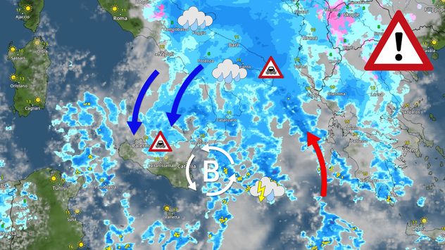 Il minimo depressionario posizionandosi sulla Sicilia orientale causerà un richiamo di umide correnti di scirocco verso la Puglia e la Basilicata, con rovesci e temporali che dallo Ionio continueranno a risalire verso nord. Le precipitazioni sulla Sicilia settentrionale arriveranno invece da nord, grazie al richiamo di intensi venti di Tramontana e Grecale.