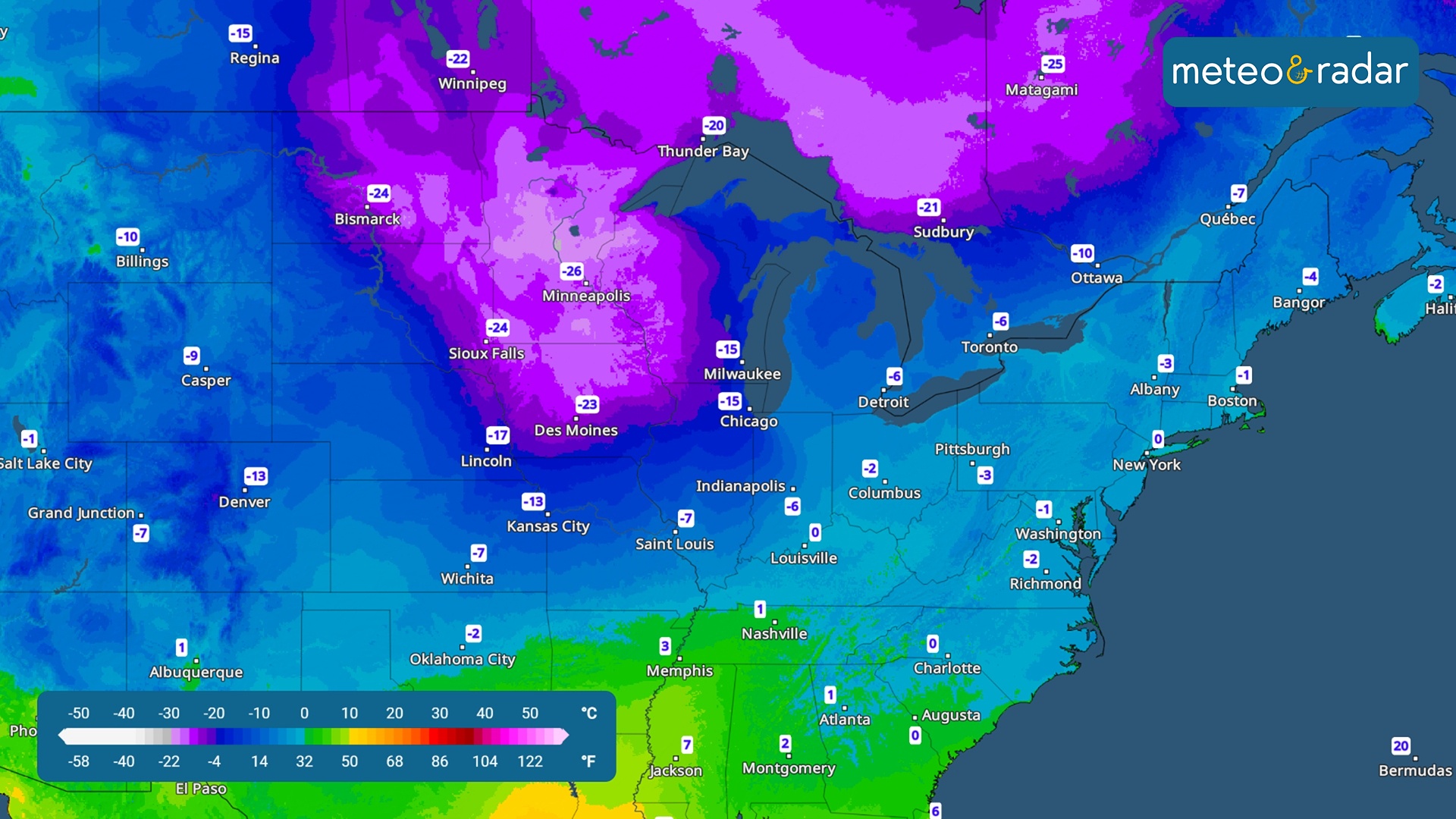 L'inverno sta davvero arrivando nel Midwest degli Stati Uniti. Dal North Dakota, al confine con il Canada passando per Chicago, le temperature massime odierne sono abbondantemente negative, oscillando da -5°C a -2°C. A partire da mercoledì, l'aria gelida proveniente dal Canada settentrionale invaderà la regione. Di notte, su alcune località le temperature scenderanno fin sotto i -30°C. Su alcune zone durante il giorno, i valori non riusciranno a salire sopra i -10°C.