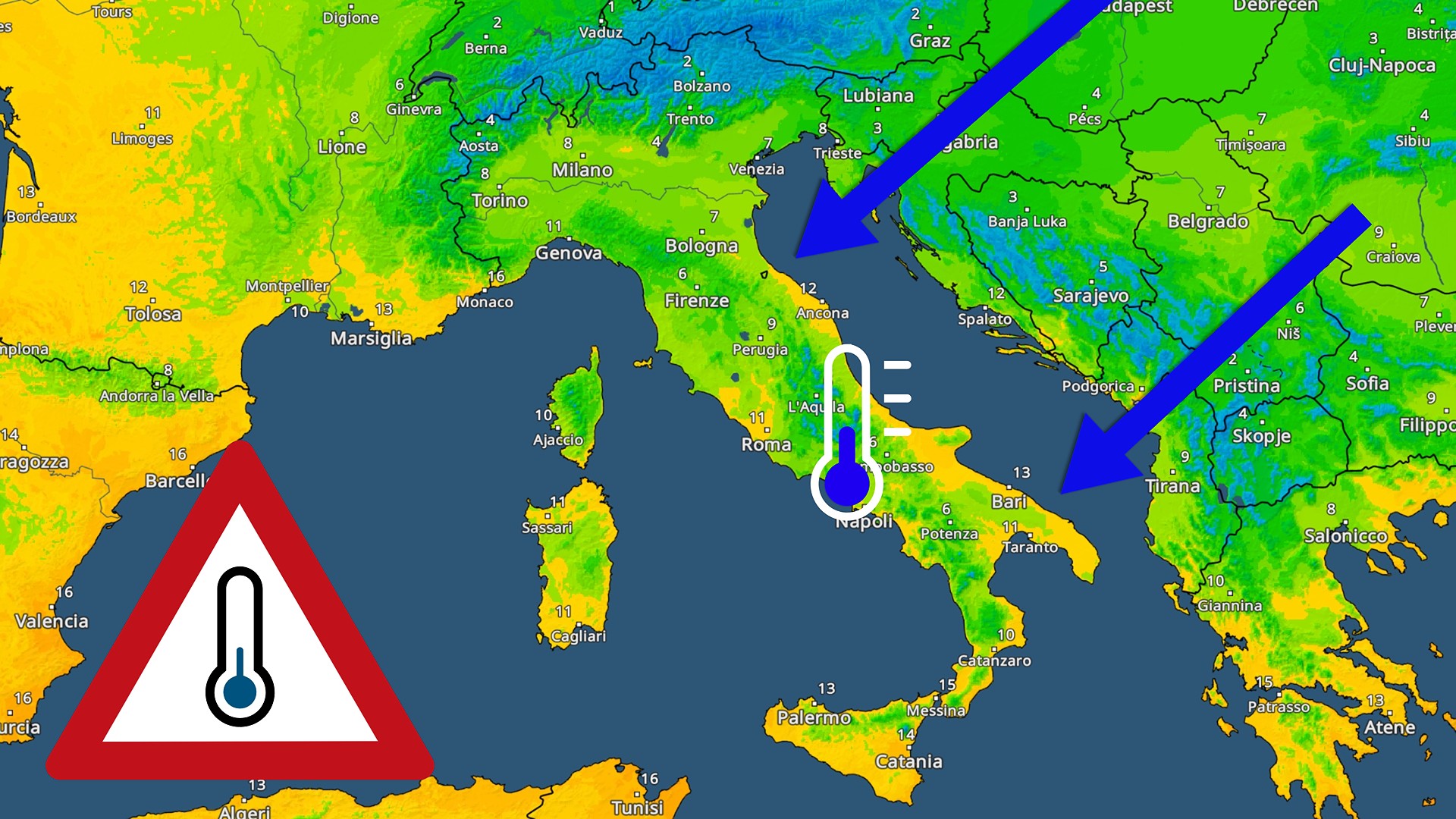 A sinistra si vede il Cervino con tempo soleggiato e il paesaggio montano circostante. A destra, una mappa meteorologica mostra temperature elevate.