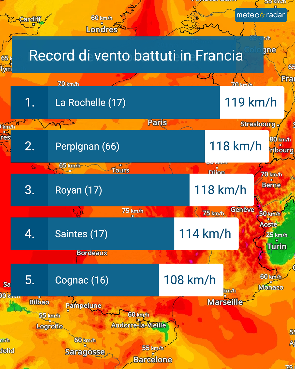 Record di vento battuti nella notte tra mercoledì e giovedì in Francia.