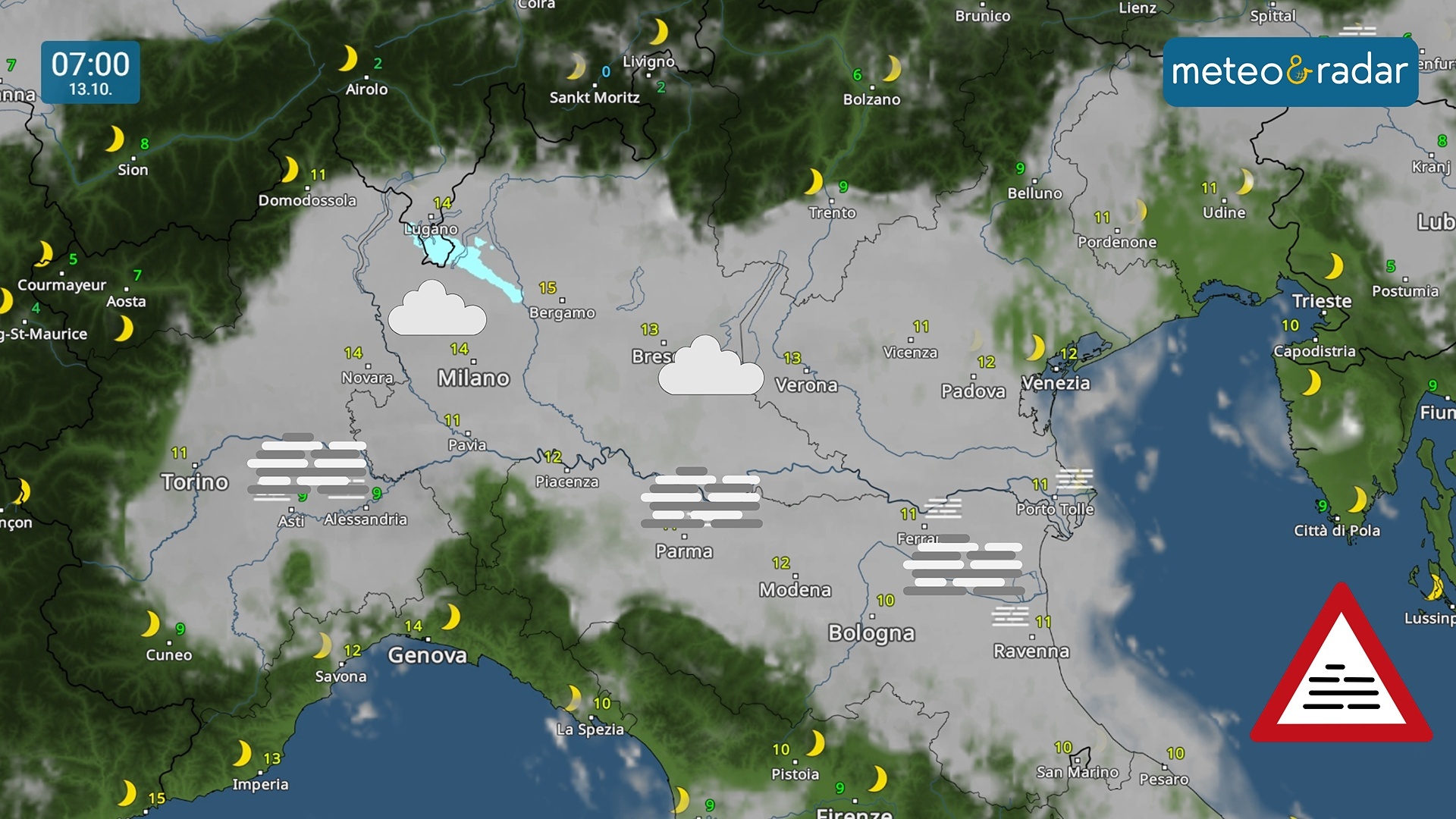 Radar Meteo: lunedì mattina nubi basse e nebbie domineranno la scena sulle pianure del nord.