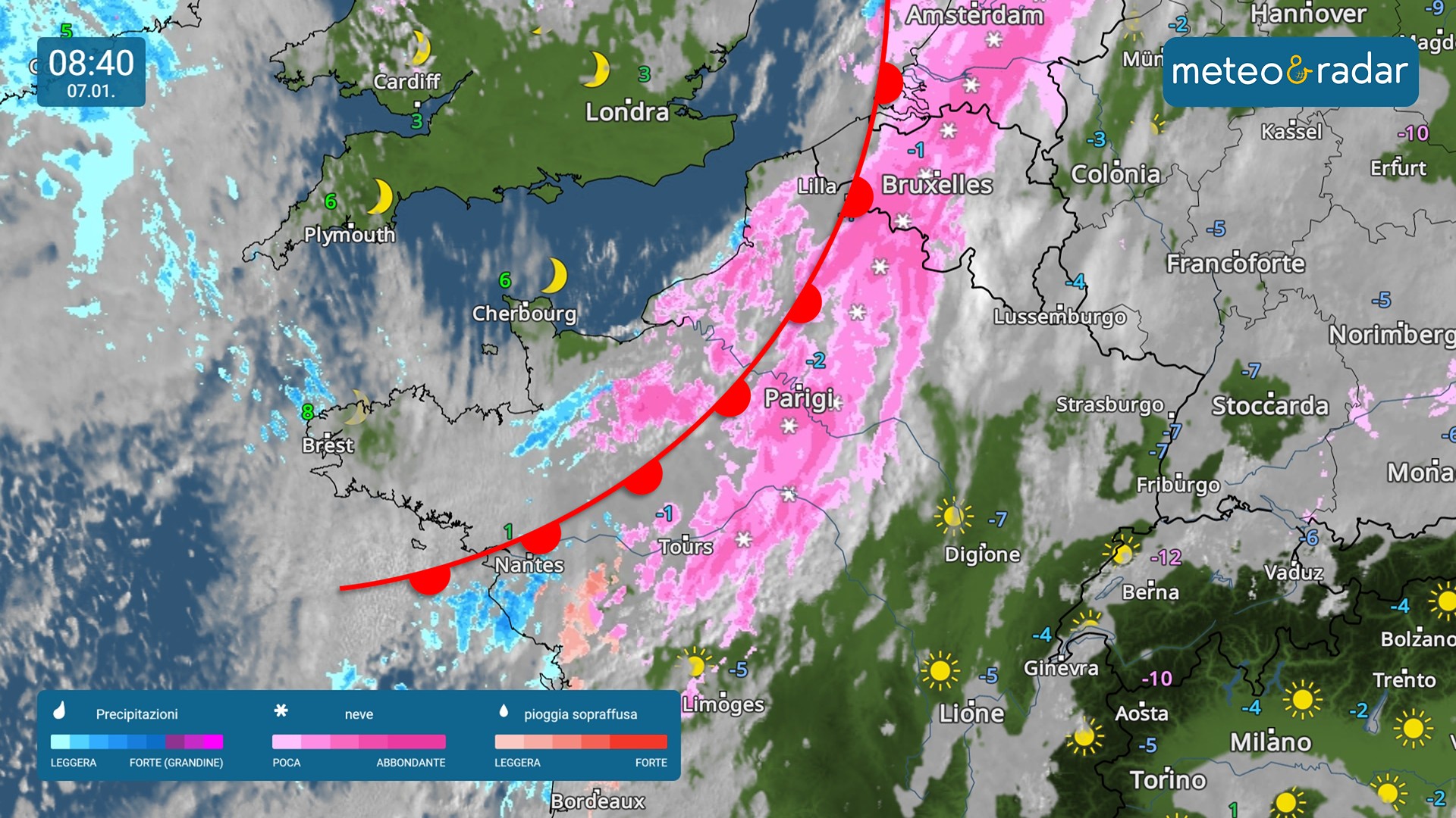 L'ondata di freddo artico raggiunge in questi giorni la massima forza, portando un'ondata di maltempo invernale sui paesi dell'Europa centrale e occidentale. Le temperature sono scese sotto lo zero su Regno Unito, Francia, Germania e perfino sulla Spagna. Le precipitazioni nevose in queste condizioni hanno facilmente conquistato le quote pianeggianti. 10 cm di neve fresca sono caduti su Parigi, non accadeva dal 2018. Neve anche su Colonia/Bonn, Amsterdam e Francoforte.