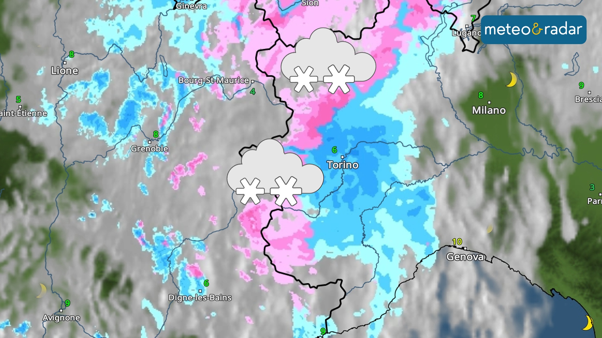Radar Meteo: le fitte nevicate di questa mattina sull'angolo nord-occidentale italiano.