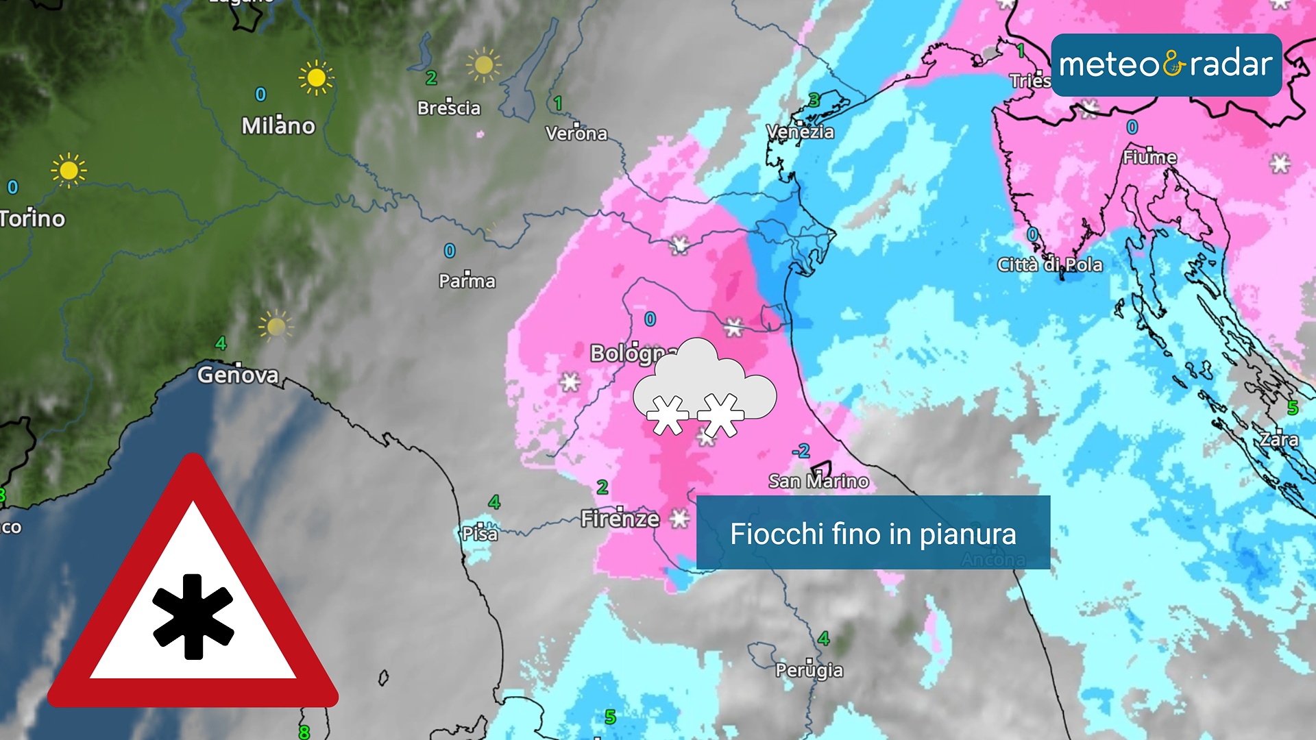 Nevicate fino pianura stanno interessando in questo momento parte del nord-est e dell'alto versante adriatico. Fiocchi fino alla costa tra il Ravennate e il Pesarese.