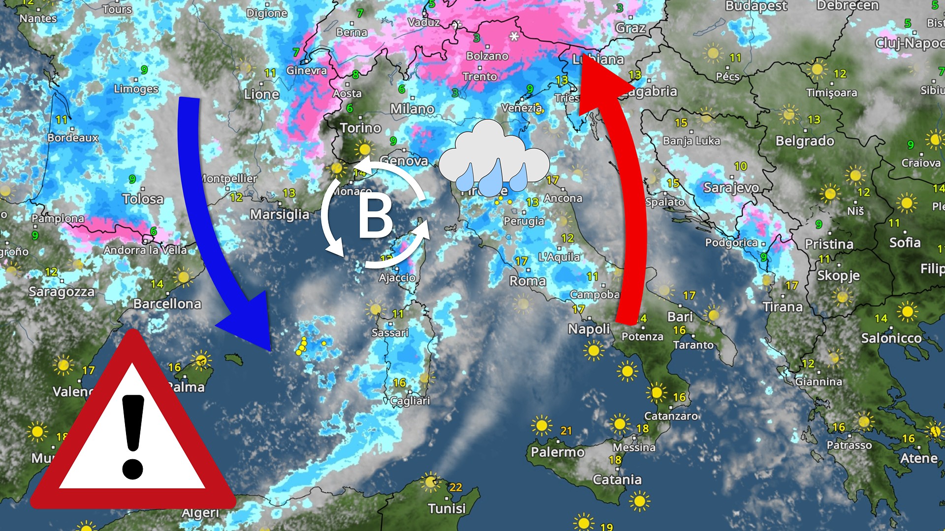 Un ampio vortice di bassa pressione con perno sulle regioni centrali tirreniche spinge le nubi appartenenti a un fronte occluso verso l'Emilia-Romagna, dove le precipitazioni sono già cadute in abbondanza e persisteranno anche nelle prossime ore, esaurendosi non prima di martedì sera. Le maggiori cumulate si stanno verificando proprio a cavallo tra la Romagna e le Marche, dove i terreni a bassa quota si stanno saturando e il livello di alcuni corsi d'acqua hanno già raggiunto la soglia di attenzione.