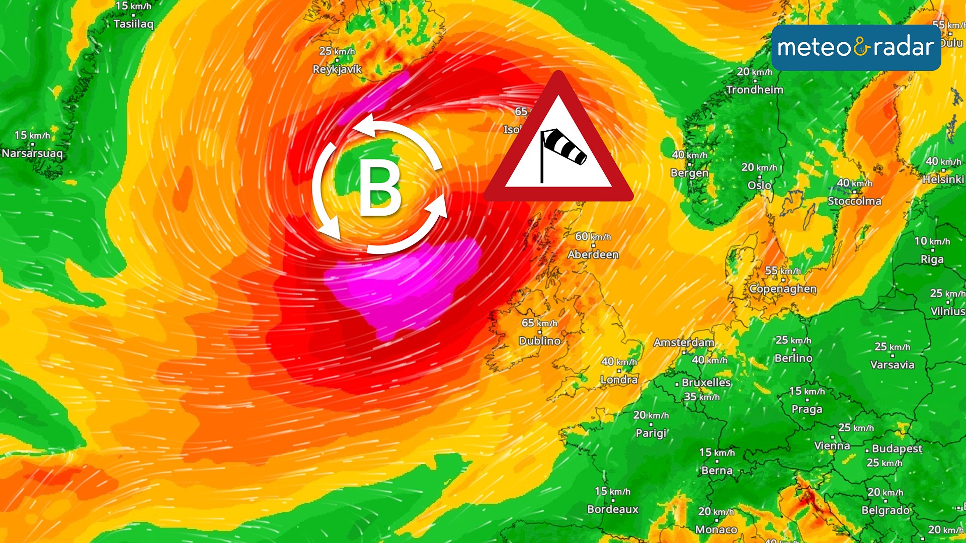 Radar Vento: raffiche di tempesta sul nord-ovest Europa, legate all'ingresso di un'importante depressione.
