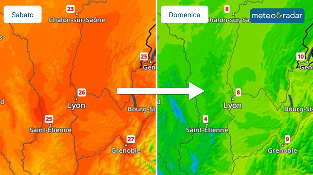 Il radar delle temperature mostra chiaramente il robusto calo termico. A Lione, nel sud-est della Francia, le temperature scenderanno di circa 20 gradi.