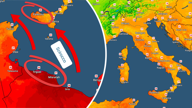 Combinazione di una mappa meteorologica europea con simboli lunari e foto di una luna piena sopra una foresta scura. In molte regioni sono rappresentate notti limpide e asciutte.