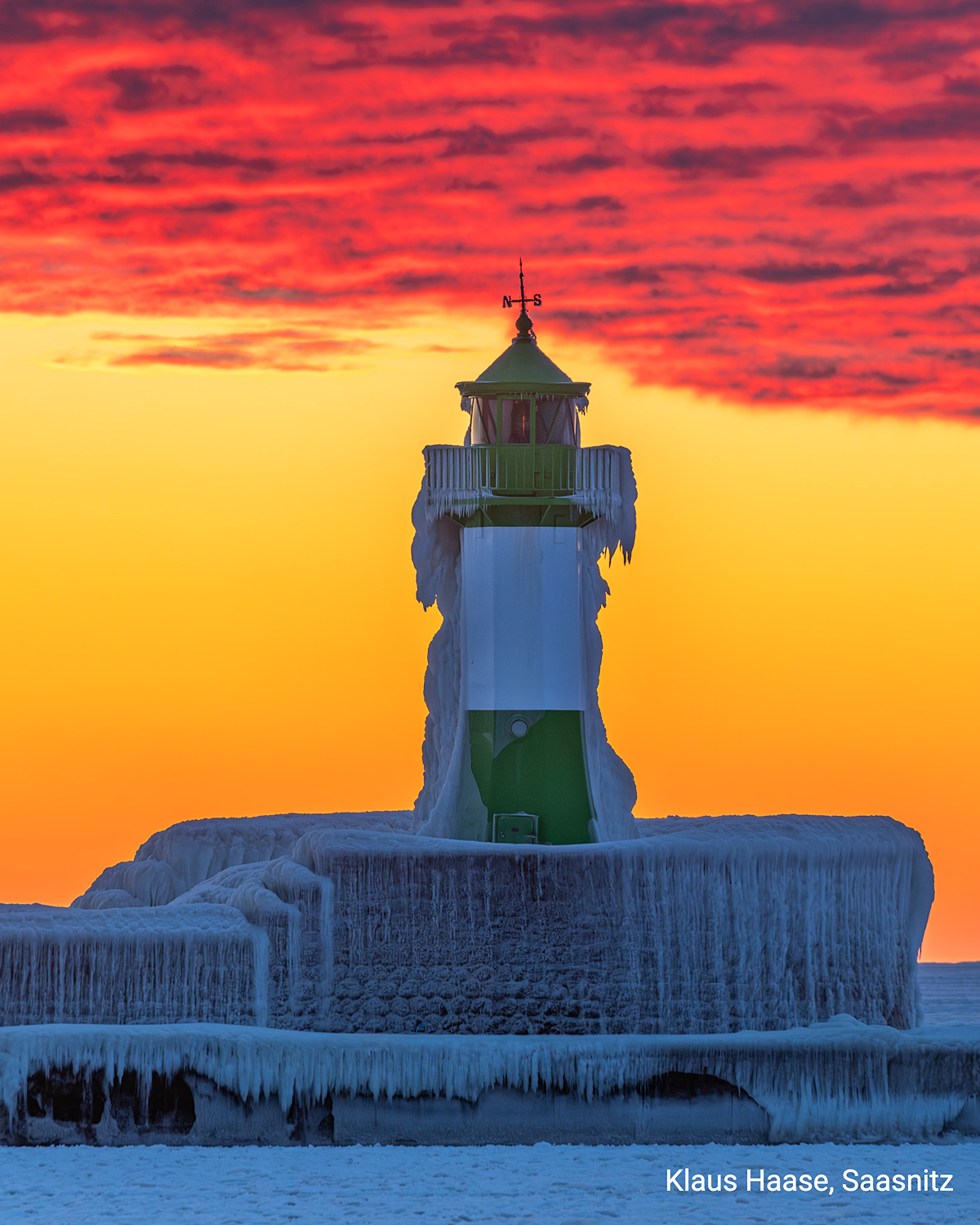 Un simbolo in uno stato di emergenza. Sul lato esposto alle onde del faro di Sassnitz, sull'isola di Rügen, la schiuma congelata ha dato vita a affascinanti forme di ghiaccio.