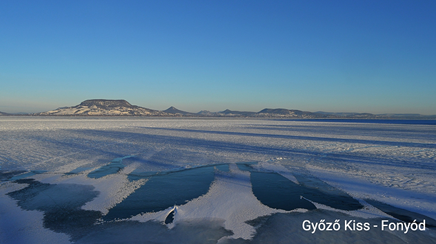 Il lago Balaton è in gran parte ghiacciato, con una struttura di ghiaccio sulla superficie. Sullo sfondo si vedono le colline e la sponda opposta. Cielo sereno sul paesaggio invernale del lago.Grande superficie ghiacciata, in parte chiusa, sul lago Balaton. In primo piano si vedono lastroni di ghiaccio frammentati e acqua scura. All'orizzonte si stagliano dolci colline sotto un cielo limpido.Dettaglio della superficie ghiacciata del lago Balaton. Una crepa scura attraversa il ghiaccio congelato. La superficie presenta strutture ruvide e ghiacciate.