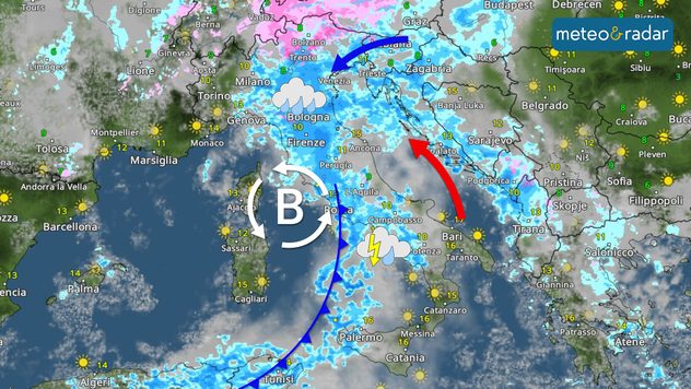 Un flusso oceanico mite interessa il Mediterraneo, con un fronte perturbato che, grazie alla formazione di un minimo depressionario sul medio alto Tirreno, dispenserà forte maltempo su Emilia-Romagna, Veneto, Toscana e Campania, con piogge e rovesci di forte intensità.