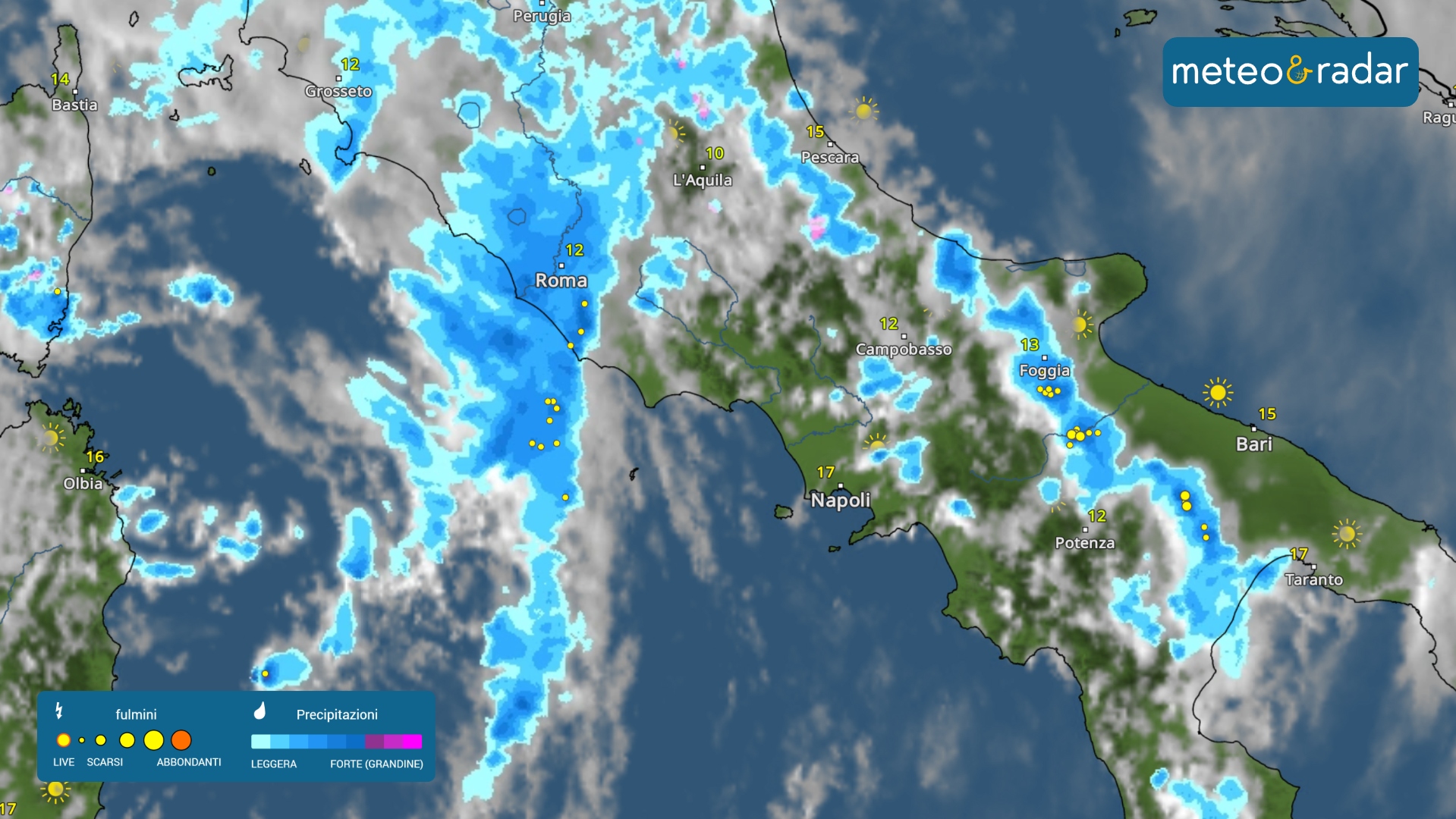 L'immagine del nostro Radar Meteo mostra il maltempo esteso sul Tirreno con piogge, rovesci, temporali e grandinate. Instabilità anche nelle zone interne di Puglia e Calabria.