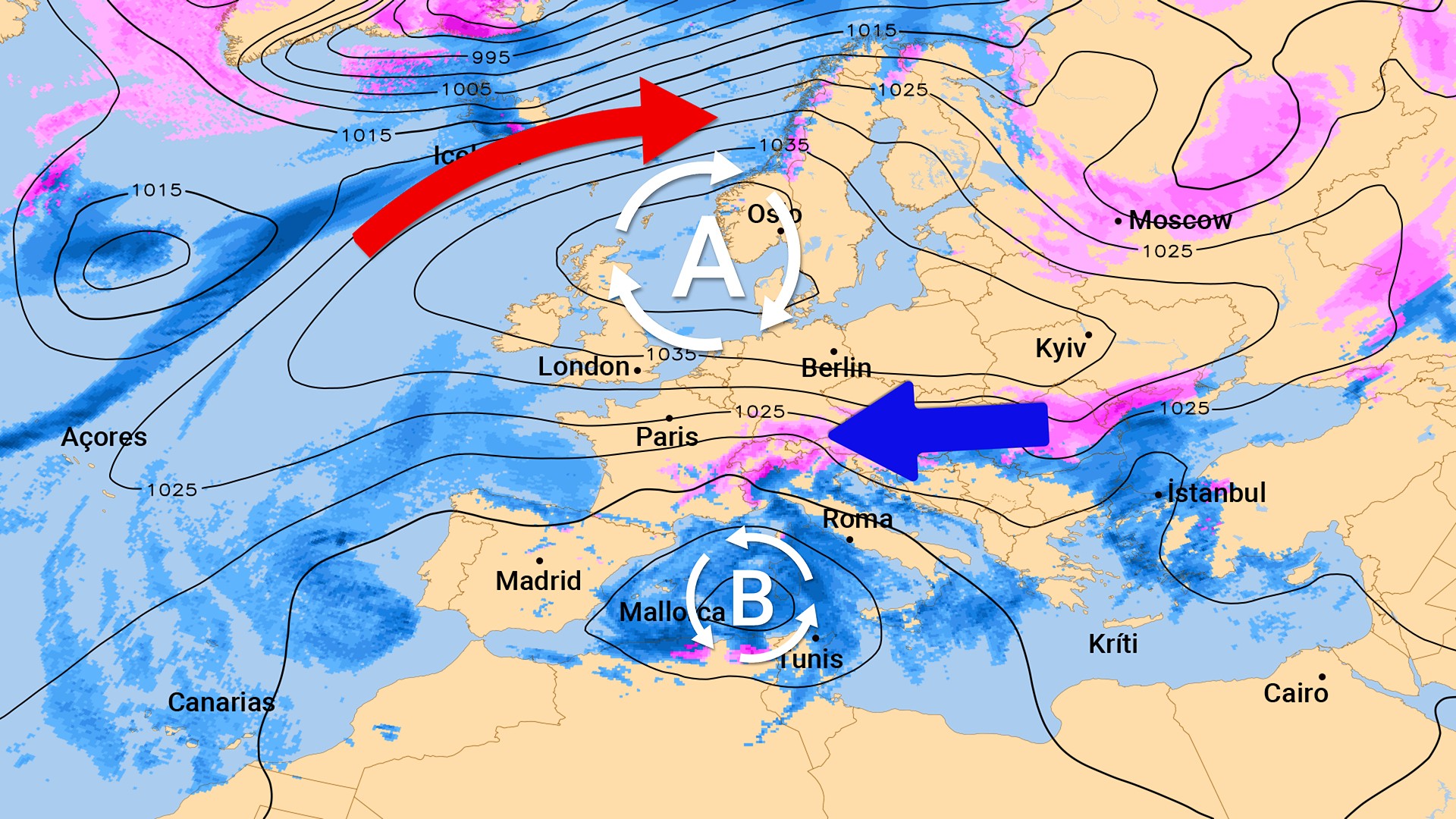 Mappa meteorologica con vaste aree innevate sulla Scandinavia e la Finlandia. Fronti nevosi si spostano da ovest verso est.