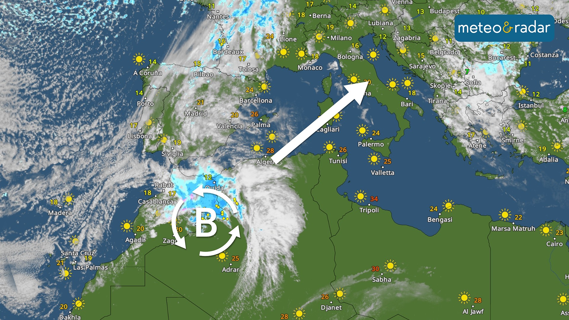 L'alta pressione vacilla e se ne accorgono soprattutto le regioni del nord, dove i disturbi nuvolosi nelle ultime ore si sono già manifestati. Tuttavia la fase perturbata deve ancora avere inizio e si manifesterà a partire da domani con l'arrivo di un vortice instabile dal Nord Africa. L'immagine del nostro Radar Meteo mostra chiaramente la presenza della depressione tra Marocco e Algeria. Nelle prossime ore la perturbazione verrà trascinata verso l'Italia grazie alla spinta offerta dall'evoluzione di una saccatura atlantica sull'Europa occidentale.