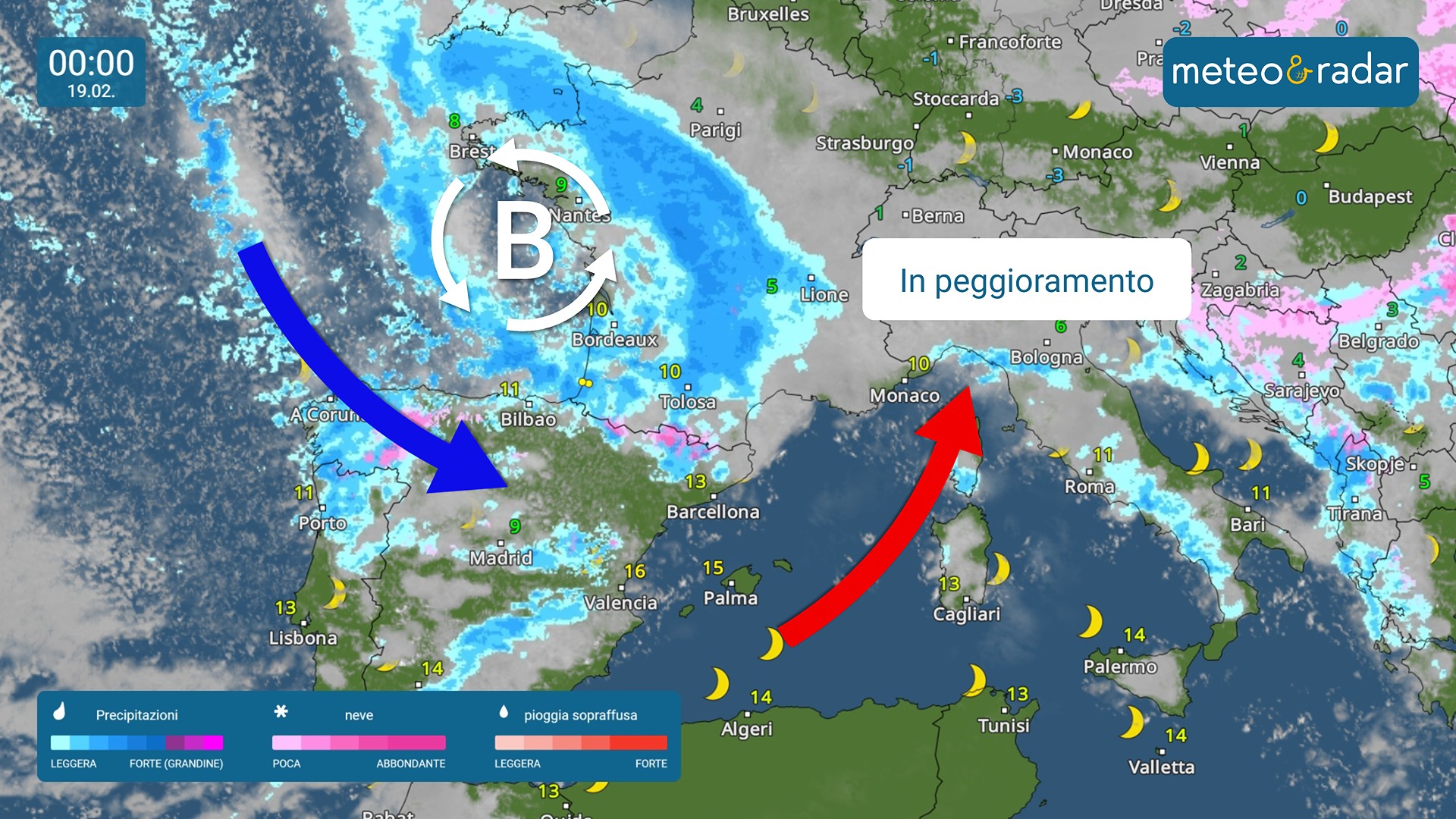 Radar Meteo: il nuovo fronte perturbato in avvicinamento nella notte tra mercoledì e giovedì.