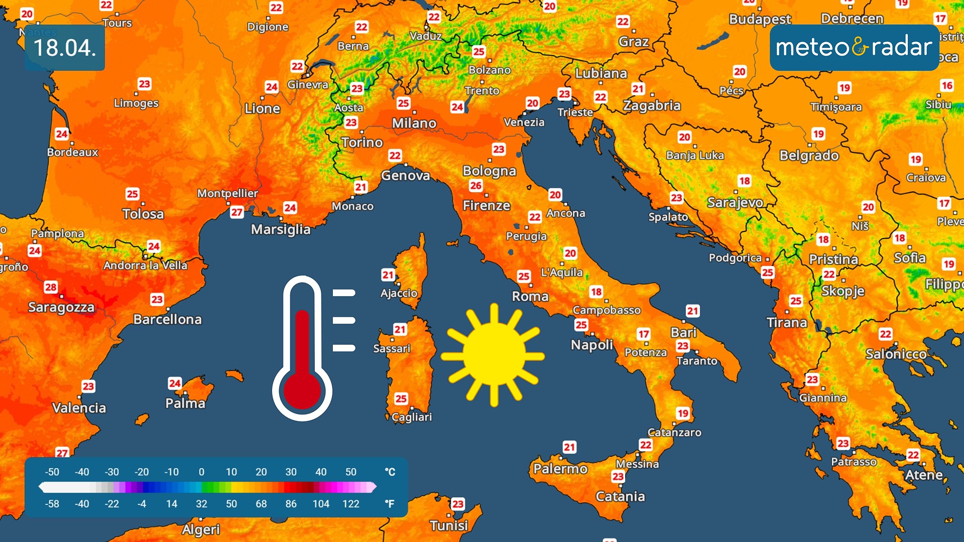 Radar temperature: i valori massimi previsti sabato 18 aprile.