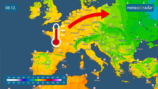 Alcune regioni europee come Francia, Germania, Austria si preparano ad affrontare anomalie positive di temperatura fino a 12 gradi sopra alla media del periodo. Le temperature tenderanno ad aumentare anche in Italia, sebbene i valori previsti non raggiungeranno le anomalie previste sull'Europa centrale.