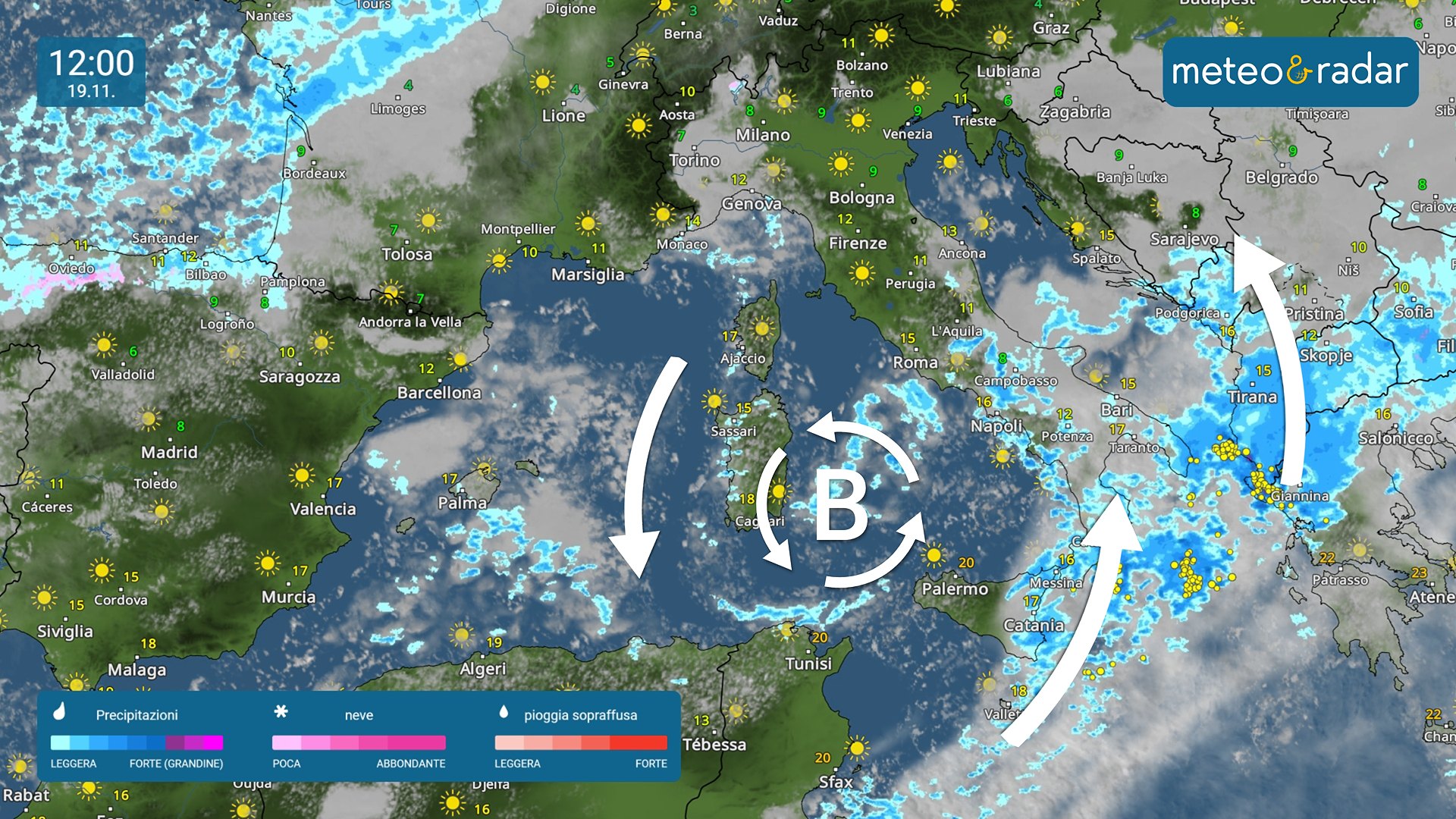 Radar Meteo: ancora tempo instabile al centro e al sud per mercoledì 19 novembre.