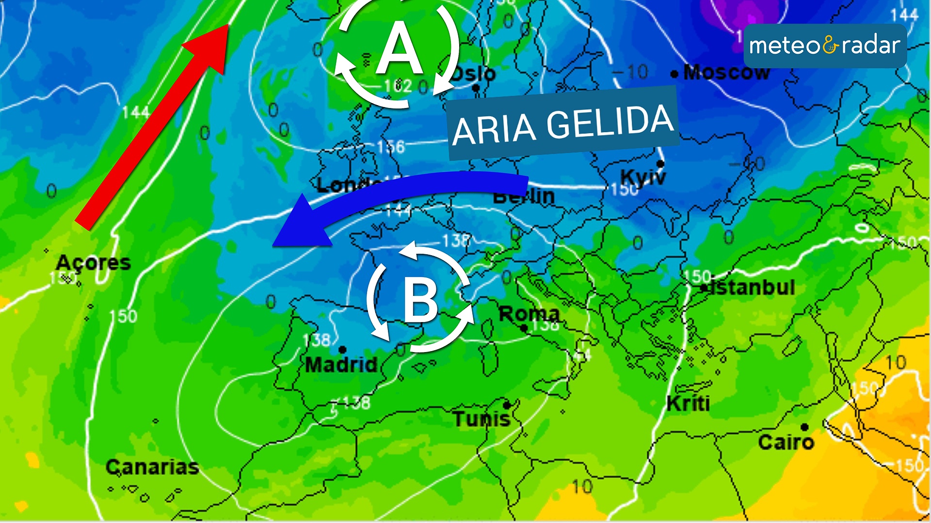 Mentre la Scandinavia diventerà sede di un forte anticiclone con valori di pressione stimati oltre 1030hPa, l’Europa sarà interessata da venti freddi da nord-est, mentre il Mediterraneo diventerà sede di una ciclogenesi.