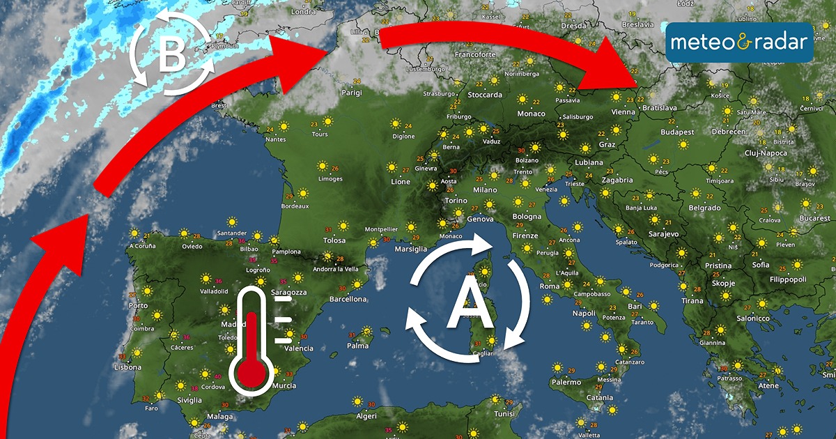 Come mostra il nostro Radar Meteo, l'ondata di calore si dipanerà dalla Penisola Iberica verso l'Europa centrale e l'Italia.