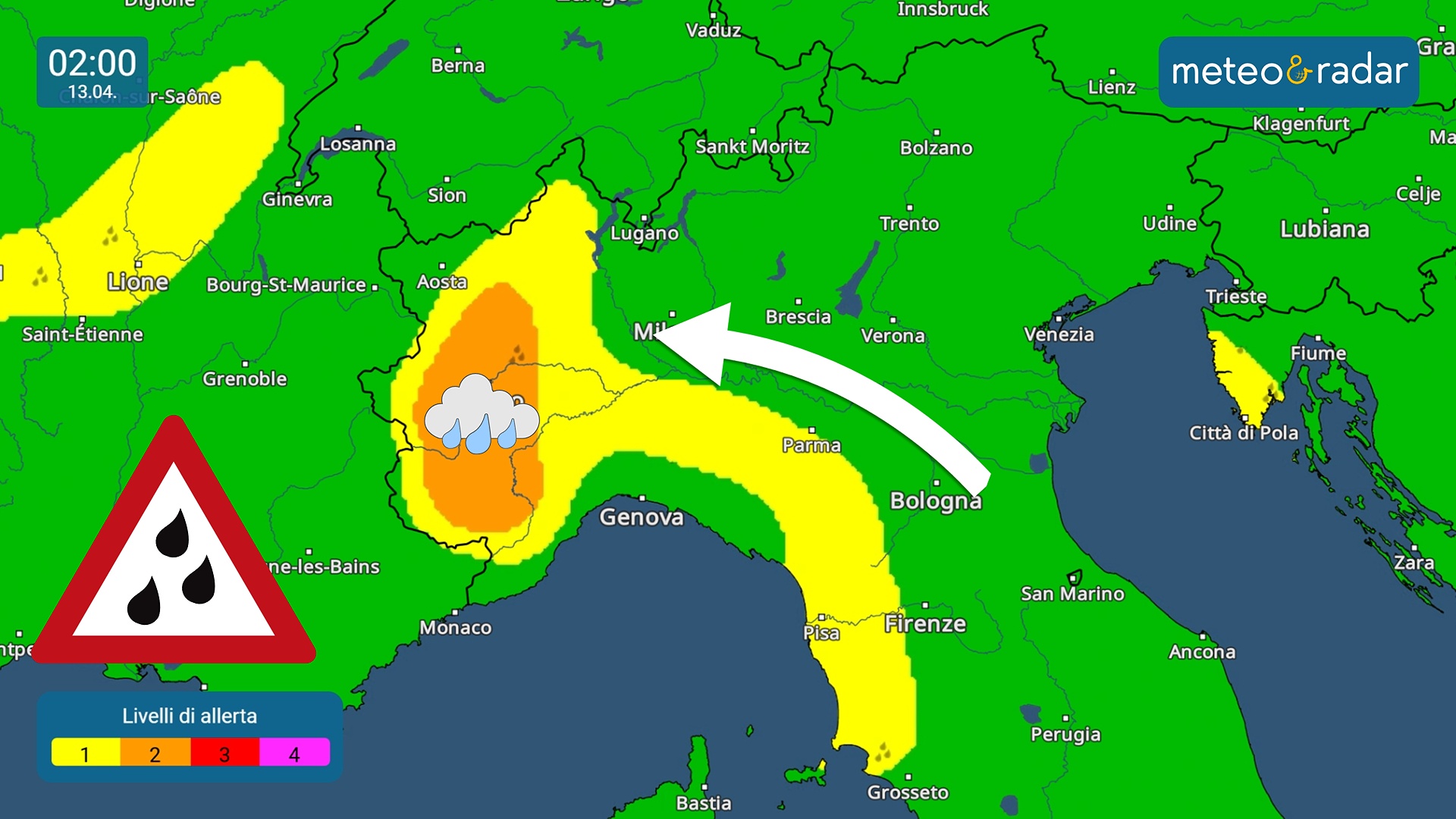 Un'ondata di maltempo si preannuncia principalmente per le regioni nord, soprattutto sull'angolo nord-occidentale, la Sardegna, il medio ed alto versante tirrenico, Liguria inclusa. Lunedì 13 intense precipitazioni impegneranno soprattutto il Piemonte e la Valle d'Aosta, sopra i 2.000 metri la neve cadrà copiosamente. Il fronte caldo porterà piogge anche su Lazio, Toscana e Liguria. Instabilità con rovesci e temporali occasionali sulla Sardegna.