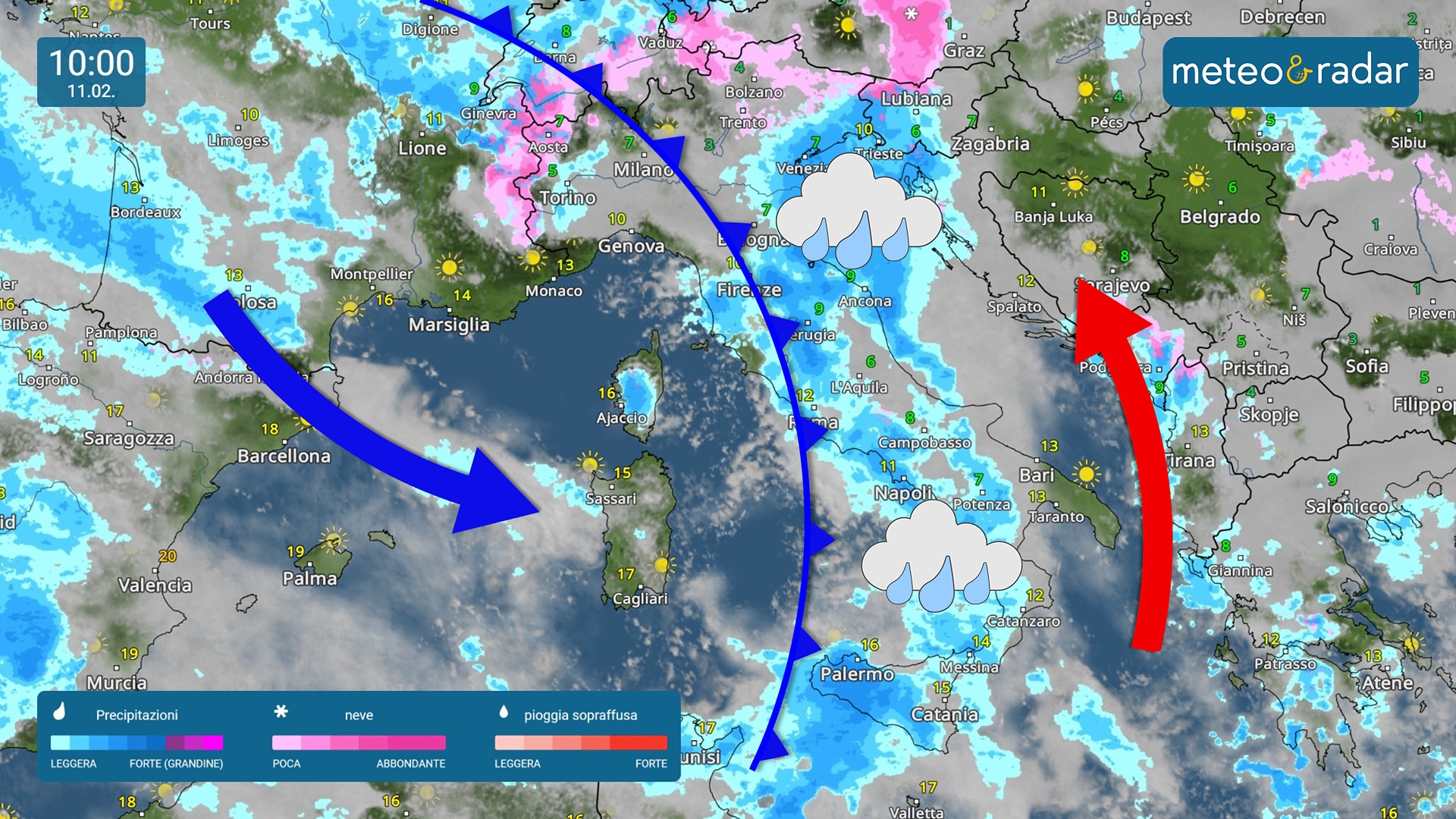 Radar Meteo: il nuovo fronte perturbato previsto sull'Italia mercoledì 11 febbraio.