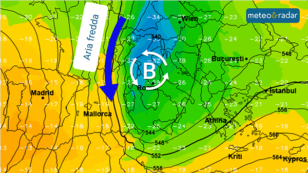 Aria fredda proveniente da nord sta per raggiungere il Mediterraneo centro-orientale, ricalcando un disegno molto simile a quello sperimentato i giorni scorsi. In questo frangente la nuova irruzione fredda sarà complessivamente inferiore rispetto a quella avvenuta tra venerdì e sabato ma sarà comunque in grado di riportare le temperature sotto la media su quasi tutte le regioni. L'immagine del nostro Radar Meteo riferita a martedì, mostra lo sviluppo esplosivo di un nuovo vortice di bassa pressione che avrà perno sulle regioni del sud.