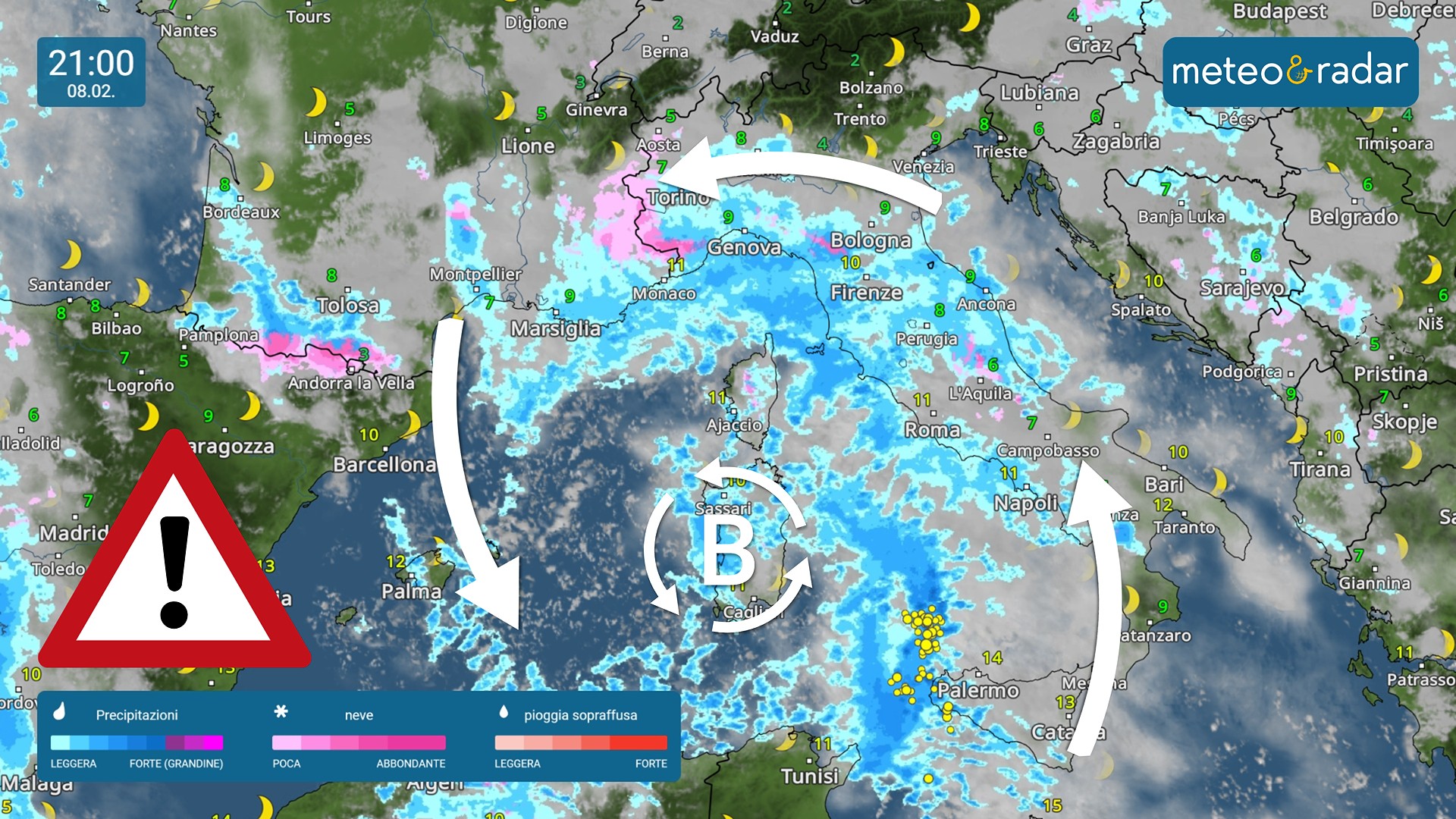 Rovesci di pioggia associati ad un nuovo rinforzo del vento ad iniziare domenica mattina sulla Sardegna, poi tra il pomeriggio e la serata anche su Campania, Lazio, Toscana, Umbria. Qualche precipitazione domenica sera raggiungerà anche Liguria e Piemonte, con neve a bassa quota.