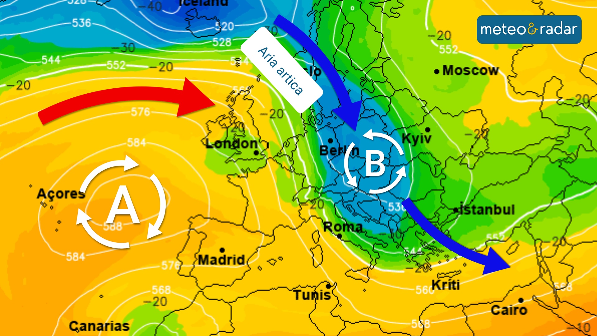 Saranno principalmente due le circolazioni che interesseranno l'Europa nei prossimi giorni; da un lato troveremo un forte anticiclone sbilanciato sulla Penisola Iberica, bloccando l'ingresso dei venti oceanici. Contrapposta all'anticiclone avremo una figura depressionaria alimentata da continui impulsi di aria artica. Questi ultimi si dimostreranno più attivi sull'Europa orientale ma saranno in grado di colpire anche l'area centrale del Mediterraneo, Italia inclusa.