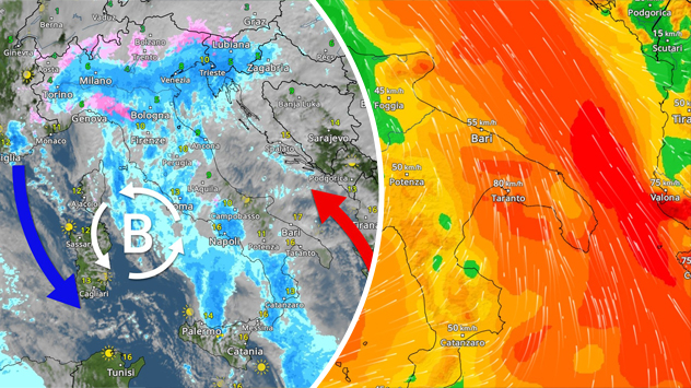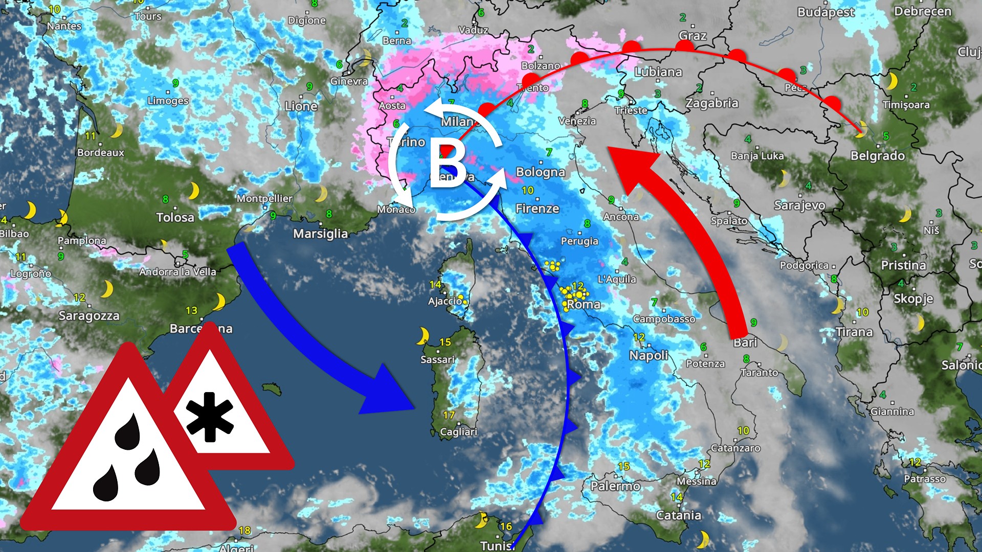 Immagine condivisa con foto della tempesta e mappa meteorologica. Visualizzazione di un possibile tornado sulla Francia.
