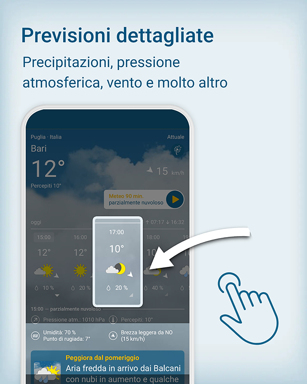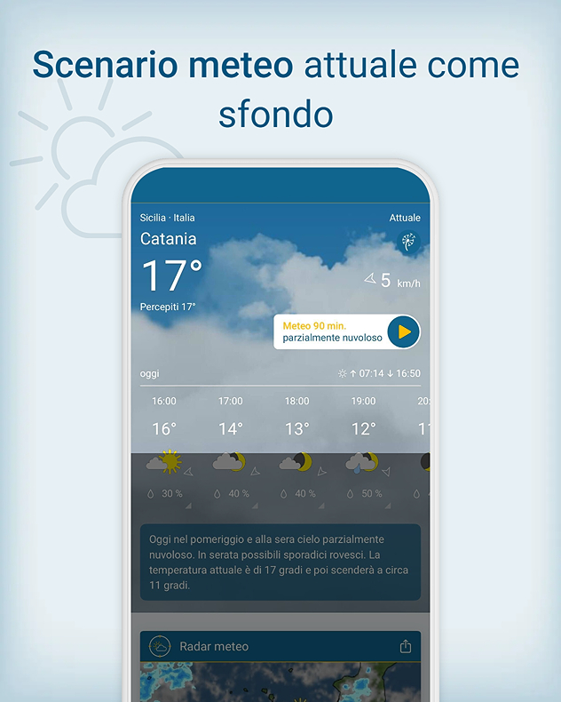 Una funzione particolarmente utile è la previsione meteo oraria, che mostra in modo chiaro come cambierà il tempo nel corso della giornata. Solenelle prime ore e pioggia nel corso della giornata? Nessuna sorpresa: basta un'occhiata al meteo orario per sapere come proseguirà la giornata.Grazie agli aggiornamenti ogni 60 minuti, puoi organizzare i tuoi impegni con maggiore tranquillità ed evitare spiacevoli sorprese. Che si tratti di lavoro, tempo libero o attività all’aperto, saprai sempre come organizzarti.