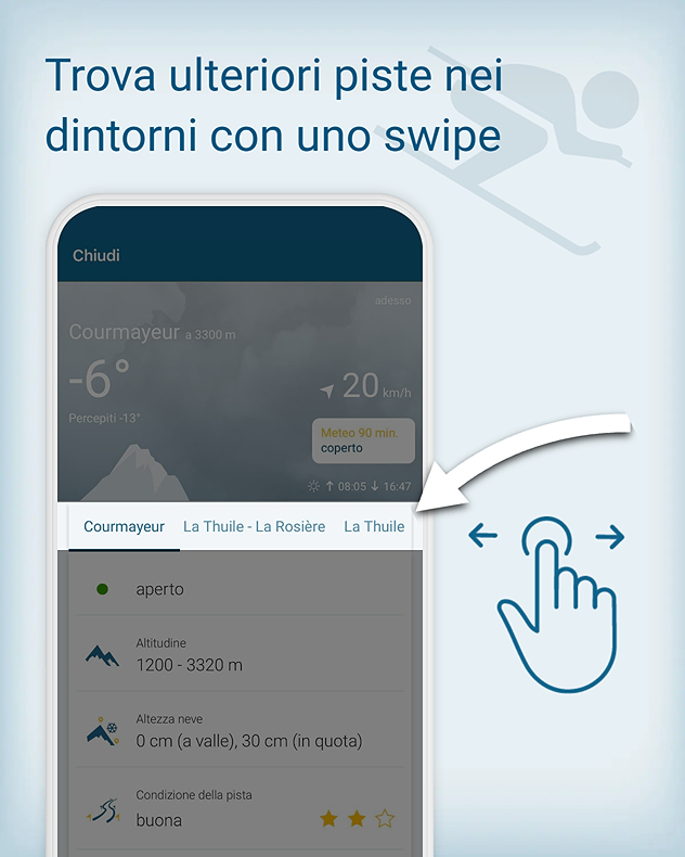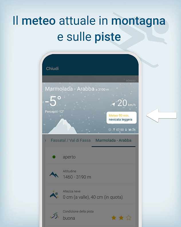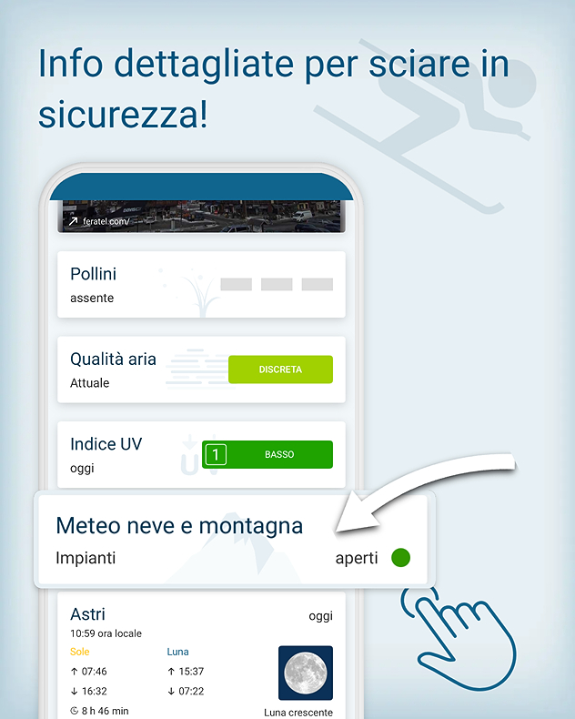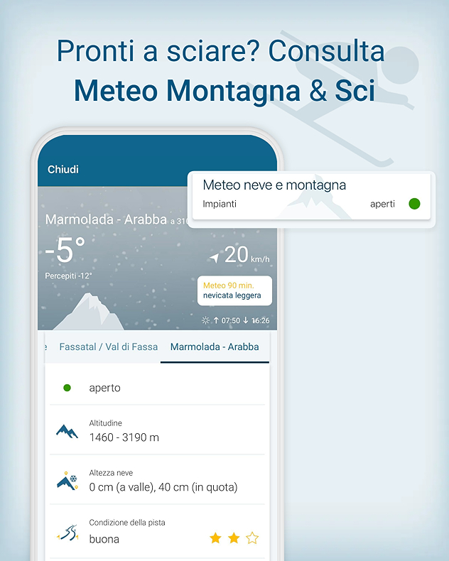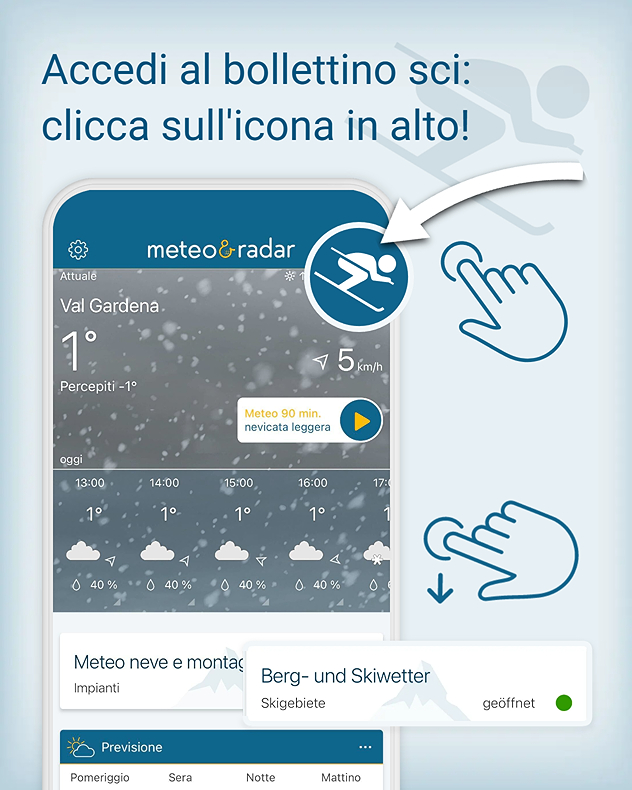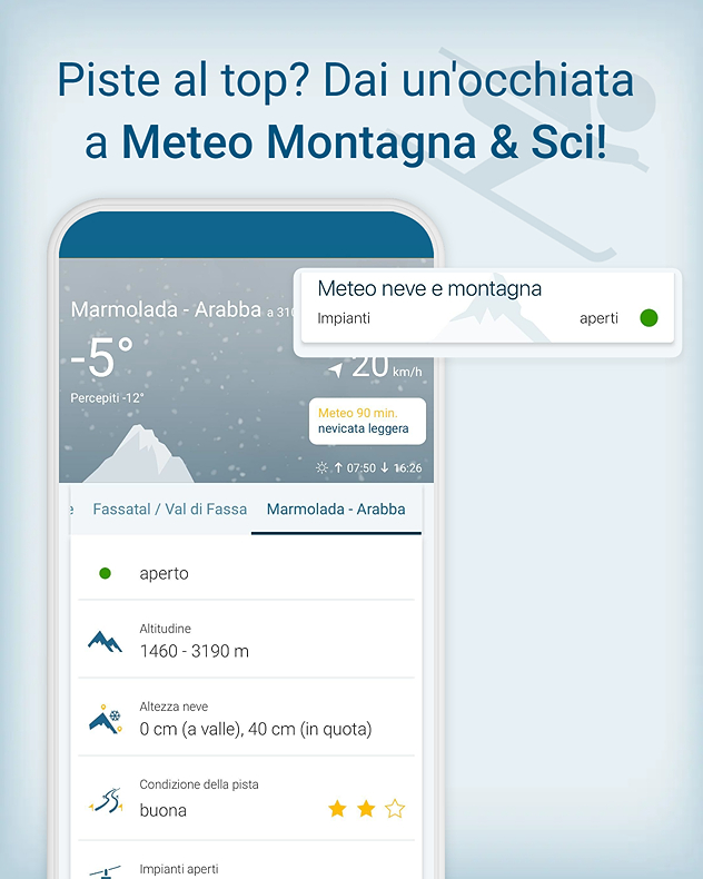 Per chi ama la neve, l’app Meteo & Radar con il suo Radar Meteo è l’alleata perfetta per l’inverno, indispensabile quanto sci, casco e bastoncini. Con la funzione Meteo Montagna e Sci saprà offrirti un servizio ancora più completo.