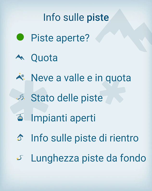Ogni giorno ti fornirà aggiornamenti sullo stato delle piste in un bollettino dettagliato, semplice e compatto. Inoltre, grazie alle immagini delle webcam, potrai vedere dal vivo la situazione relativa alla tua meta sciistica, proprio come se fossi lì.