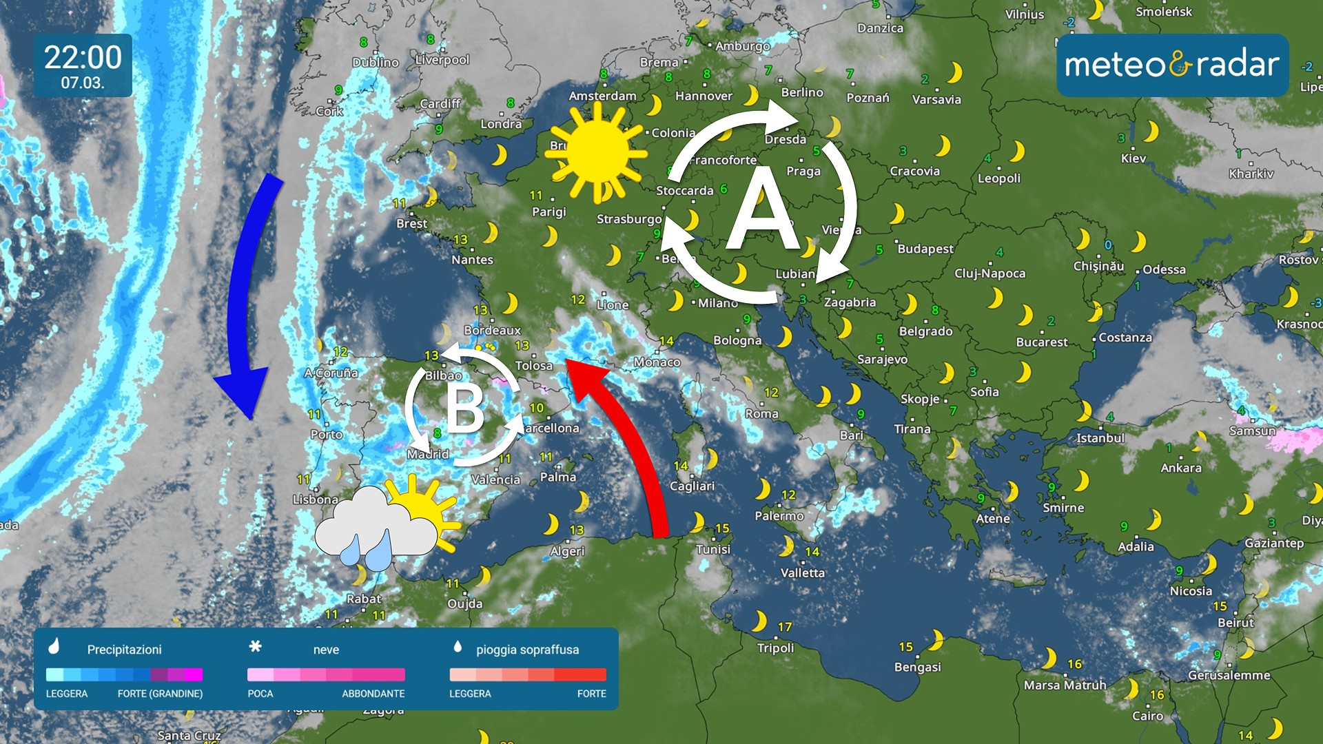 Radar Meteo: sabato 7 marzo l'anticiclone sull'Europa occidentale sarà molto forte e garantirà cieli sereni, mentre sull'area del Mediterraneo ci saranno ancora diversi corpi nuvolosi a spasso.